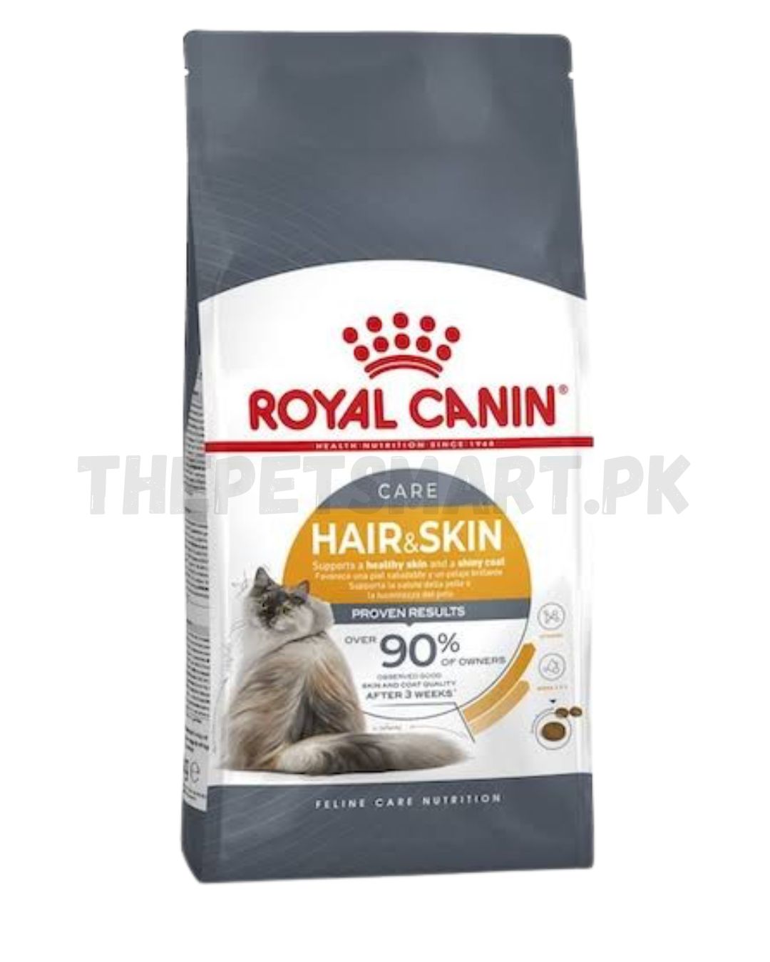 ROYAL CANIN Hair & Skin Care is an exclusive complex of nutrients that help to support the skin’s barrier role. It contains high quality proteins, including specific amino acids, to maintain healthy hair growth and skin renewal.ROYAL CANIN Hair & Skin Care includes an essential combination of omega-3 and omega-6 fatty acids for beneficial effects on skin health and coat condition. The formula also contains soya and borage oil (rich in gamma linolenic acids) as well as fish oil to help your cat maintain a healthy, glossy coat.Additionally, ROYAL CANIN Hair & Skin Care has been designed with a number of other key nutrients, such as B-vitamins, amino acids, zinc and copper. Together, these nourish your cat’s skin and fur by supporting the skin’s barrier function and maintaining optimal skin beauty as well as hair strength and density.The exclusive use of ROYAL CANIN Hair & Skin Care has been clinically proven to significantly increase coat shine after just 21 days of use.
